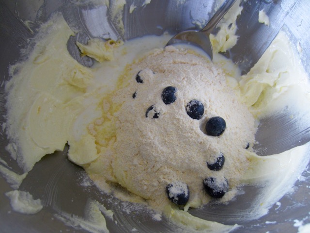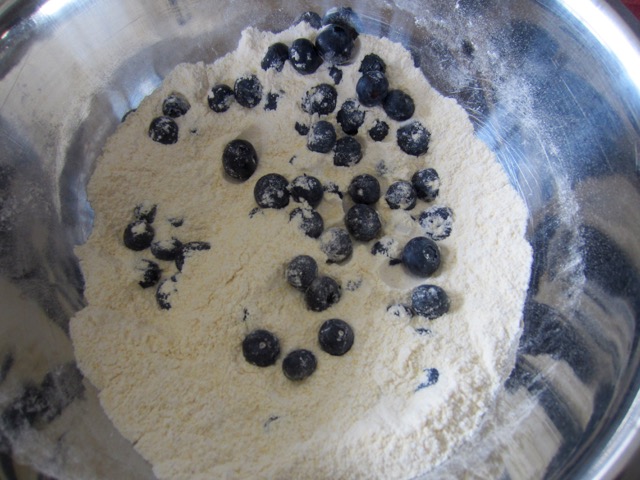 Sift the flour, cornmeal, baking powder, baking soda and salt. Stir in 1¼ cup blueberries. Set aside.