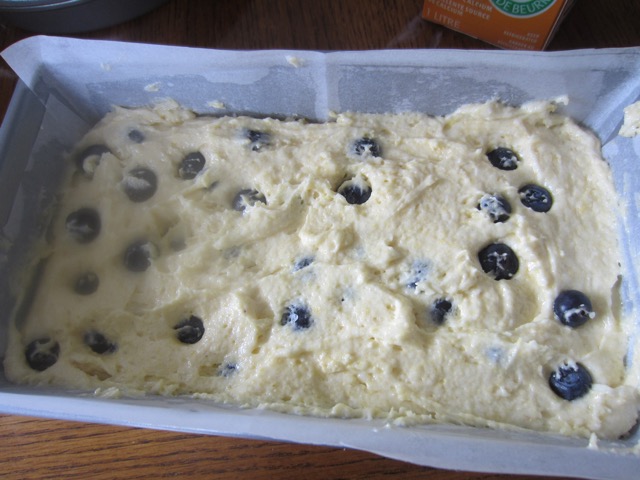 - Spoon the batter into the prepared pan, arrange the remaining ¼ cup blueberries on top and bake 45-50 minutes until golden and a toothpick inserted in the centre comes out clean.