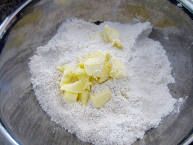 Rub in the butter, then stir in the sugar and salt.