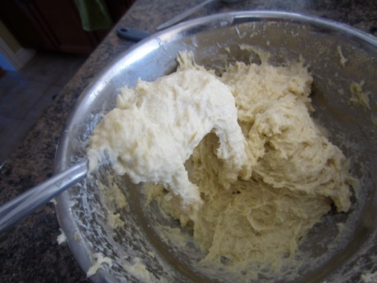 Hold he bowl with one hand and use a plastic dough scraper to mix the dough, 2-3 minutes until a dough starts to form. After about 3 minutes the dough should look like thick sticky porridge.