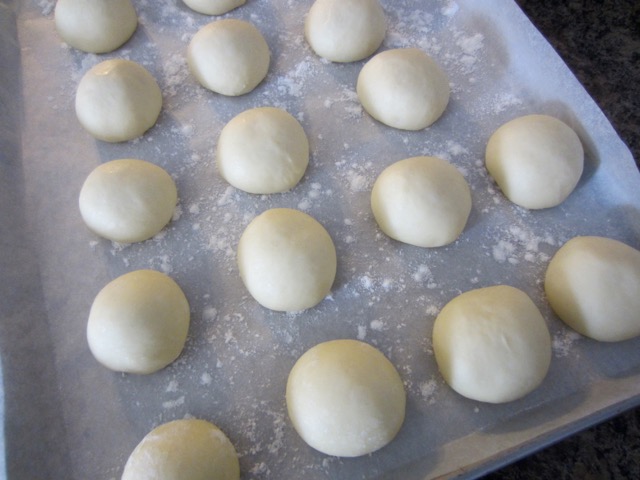 2.  With the rounded end of the scraper turn the rested dough onto a lightly floured countertop and divide and form it into 30 tight balls weighing about 1oz (30g) each. Place the balls, apart, on a baking sheet lined with parchment and sprinkled with flour. Cover the baking sheet with a lintfree towel or plastic bag and set aside 45 minutes or until doubled in size.