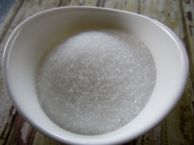 Table salt is fine grained and looks like fine sea salt. It usually contains anti-caking agents like sodium aluminosilicate, sodium ferrocyanide, or magnesium carbonate to make it free flowing and avoid clumping.
