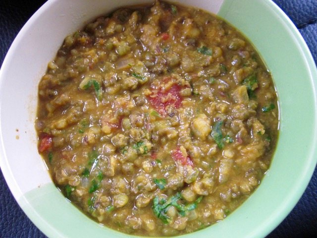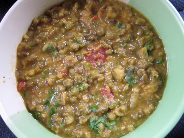 Add the boiled green gram with water used to boil it and bring to the boil and simmer 5 minutes. (if too thick add more water or stock). Add salt if necessary. Add the chopped coriander and lemon juice and serve immediately, with rice or flat bread.