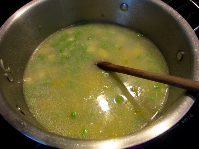- Add four cups stock (broth) and simmer about ten minutes until potatoes are tender. Add the sweet baby peas and bring back to the boil and simmer another 5 minutes.