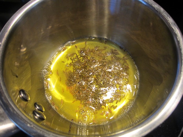 - To temper the dal: heat the ghee or vegetable oil in a small pot over medium heat and add the cumin and mustard seeds. As soon as they begin sputtering reduce the heat and add the asafoetida, garlic and chillies. Cook until garlic is light brown.