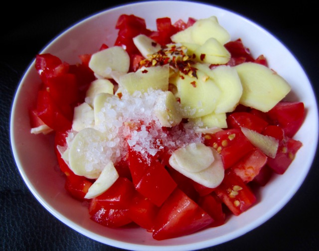 Make tomato paste: mix all ingredients for tomato paste and blend till smooth. Set aside.