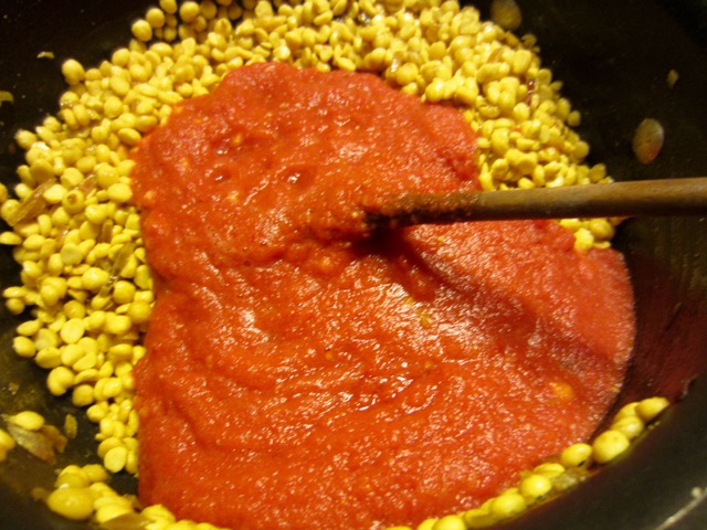 - Make the Dal: in a large pot, heat the olive oil over medium high heat then sauté onions until light golden. Add the turmeric and coriander powder and cook over gentle heat for 2 minutes. Add the soaked dal and cook another 2 minutes then add the tomato paste and water. Bring to the boil and cook 30-50 minutes or until cooked to your desired softness. Check seasoning, stir in garam masala and serve garnished with coriander leaves.
