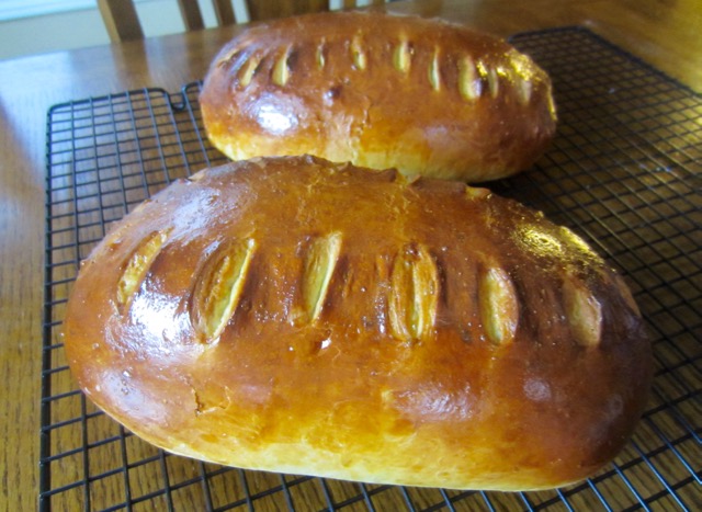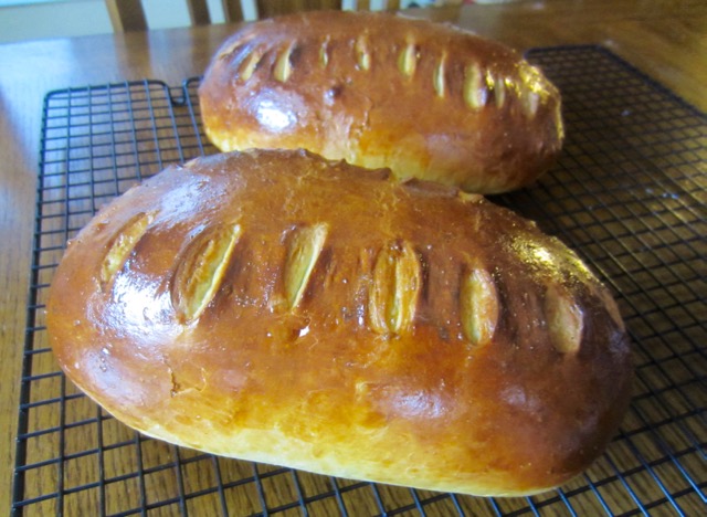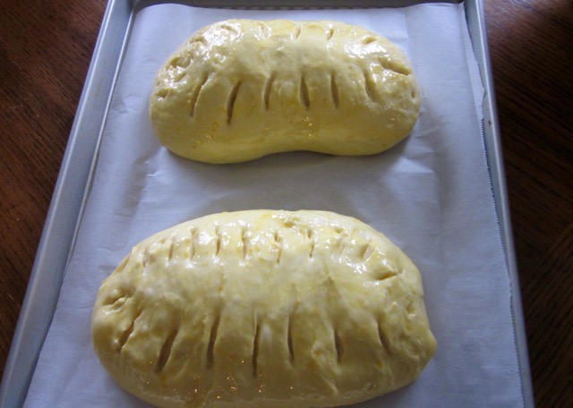 or until dough has nearly doubled in volume and is springy when prodded. Brush the risen breads again, with egg wash. Using a pair of scissors held at 45º to the surface make cuts along the top of each loaf.