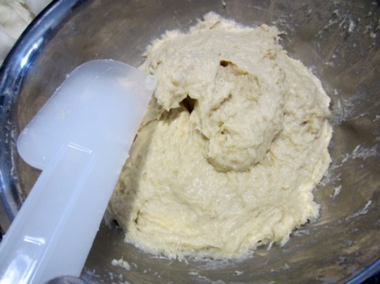 After about 3 minutes, the dough should look like thick sticky porridge. Scrape the sides of the bowl using a spatula.