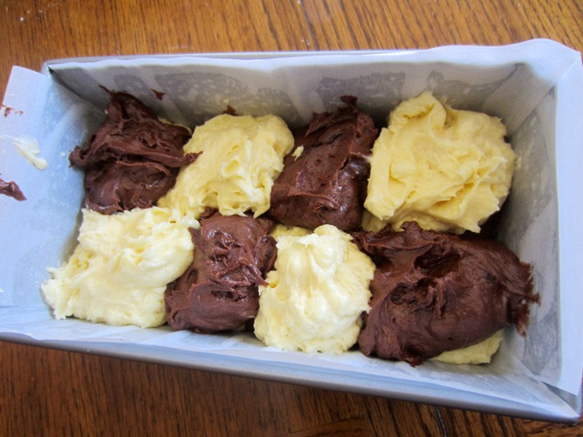 Divide the batter into two equal portions and add sifted cocoa powder and chocolate chips to one