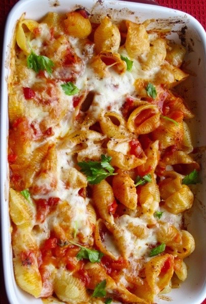 - Toss everything and Bake: Toss the pasta together with the sauce and pour into the oven proof dish and sprinkle the cheese on top. Bake 15-20 minutes on the top shelf until bubbly and slightly browned. Let rest 5-10 minutes then serve.