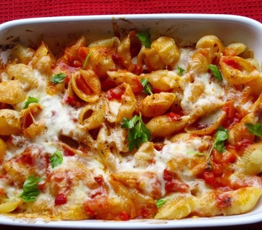 Boil the pasta, drain and toss with the sauce. Transfer to the oven proof dish and top with the grated cheese and bake 15-20 minutes, until bubbly. ENJOY!