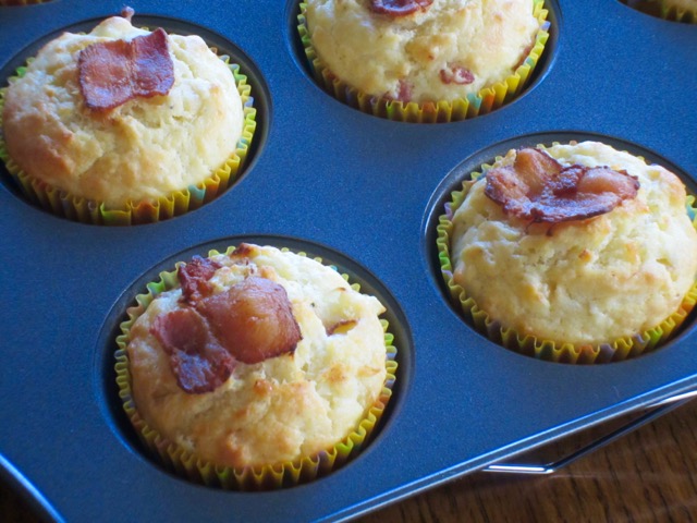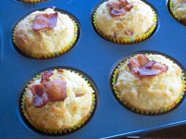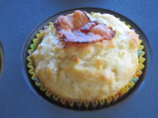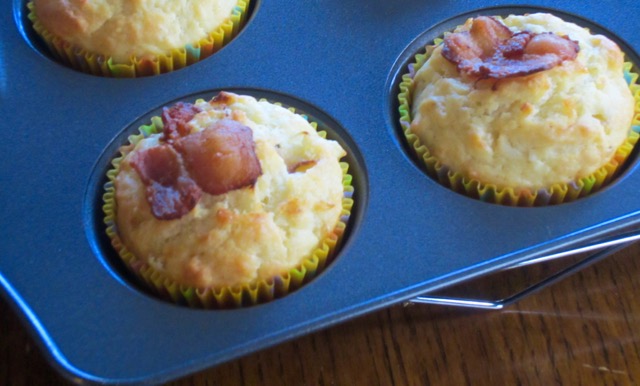1.  Line a 12 cup muffin pan with non-stick muffin cases (if not grease the muffin tin (pan) liberally with oil or spray and bake directly) .  Preheat the oven to 400ºF (200ºC),  ten minutes before using. Finely chop 4 bacon slices and then cut the remaining two slices into 12 pieces, for topping the muffins.