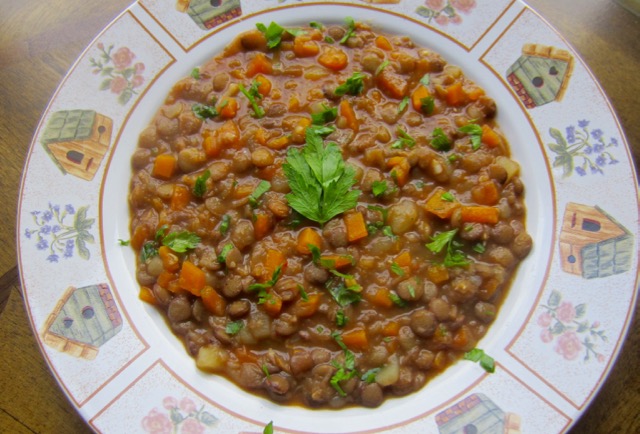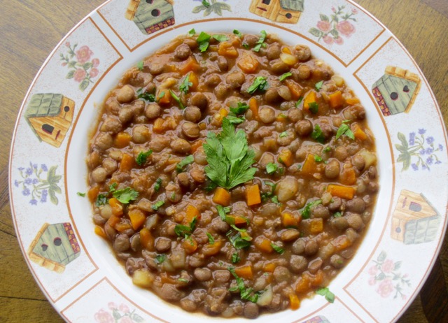 2. Add the garlic and ginger and cook, stirring for one minute. Then add the cumin and coriander and cook for two minutes, stirring. Add the passata, lentils, stock (broth) and coconut milk, and stir to combine. Bring to the boil and simmer partly covered, 15-18 minutes, or until cooked to your liking. Check seasoning and garnish with coriander. Serve hot. (if you don’t soak the lentils they’ll take 35-45 minutes to cook-in that case you’ll sweat the vegetables for a shorter time-10 minutes).