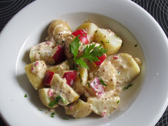 I’m not really a huge fan of potato salad, but from time to time I do enjoy having some, at lunch time. I used the so-called old fashioned dijon mustard. I find it more flavourful compared to the smooth yellow hot dog mustard. Pleasant weekend to you!
