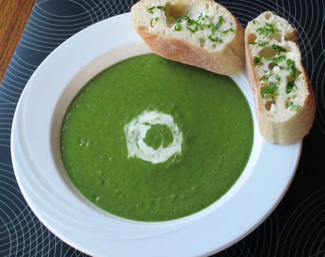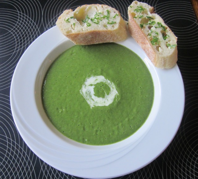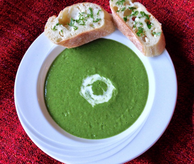 I wanted everything green and white with a splash of red and black on the background. Use tender baby spinach for this recipe and do not peel the zucchini (courgette). Serve the soup with garlic bread or some fresh rolls. I wish you a happy weekend!
