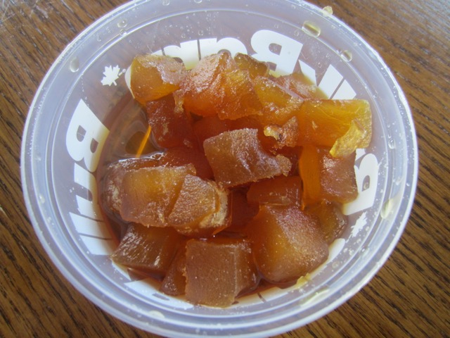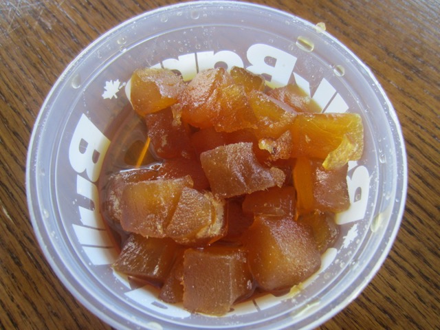 The process can take several weeks or months depending on the fruit, and its size. Eventually, the fruit becomes saturated with sugar and can have a very long shelf life. Candied ginger chunks in syrup have about 73% sugar and are stored in syrup like glacé cherries.
