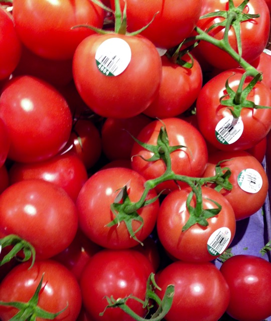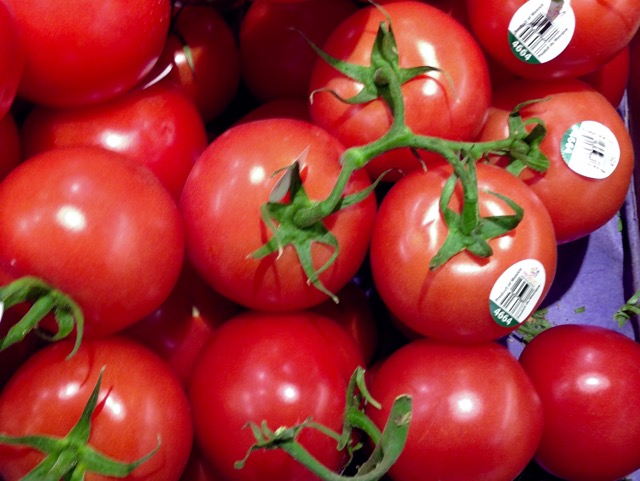 Red tomatoes on the vine are large, round red tomatoes recommended for slicing and salads, but can also be used in cooking.