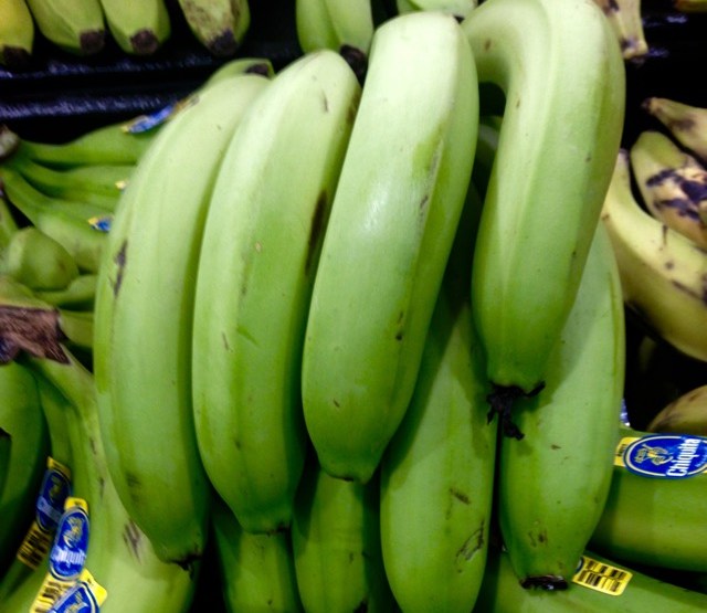 I was out shopping two days ago and found these green cooking bananas from Honduras. They are cooking bananas because they are more starchy than the regular dessert bananas.
