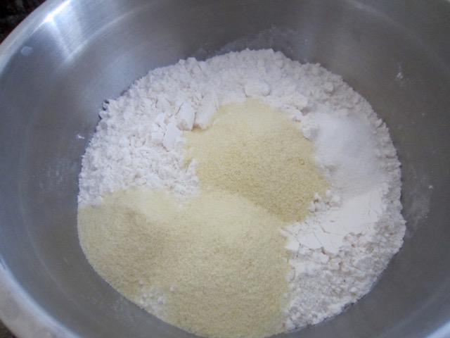 Sift or whisk the flour, semolina, instant yeast, salt and sugar into a bowl.