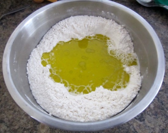 Make a well in the centre, then add the olive oil and water into the well.