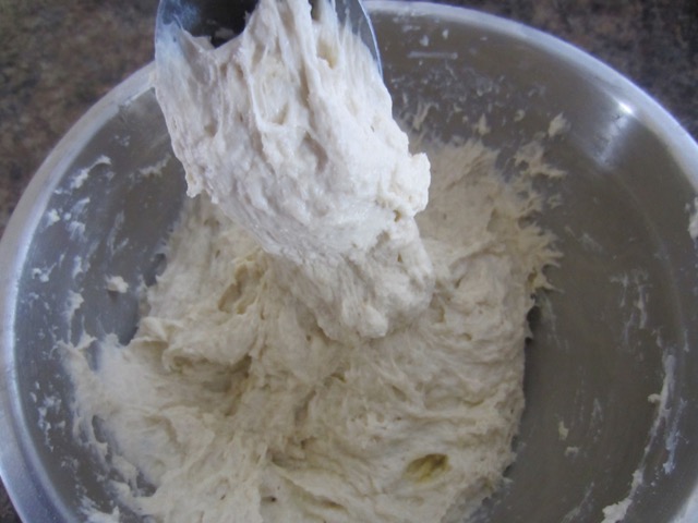Hold the bowl with one hand and use a plastic dough scraper to mix, 2-3 minutes until a dough starts to form. After about 3 minutes the dough should look like thick sticky porridge