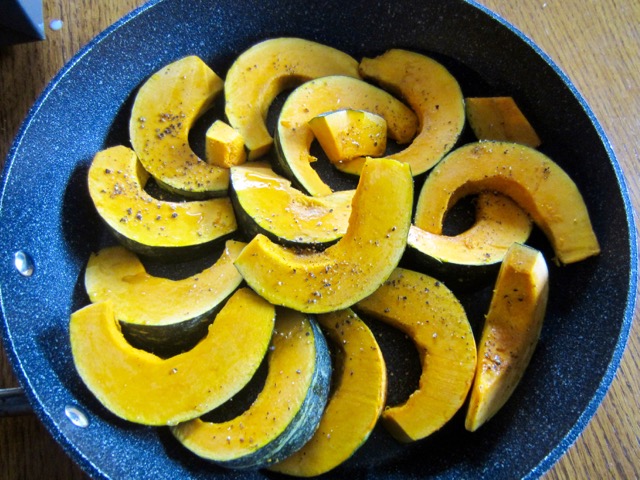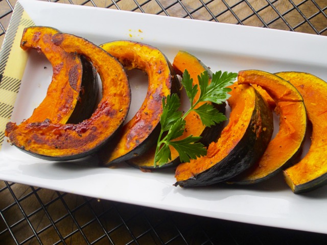 - Prepare the squash: wash the squash and cut into half through the stalk. Scoop out the seeds, then cut each half into 8 pieces, total 16 pieces. Brush the cut sides of each slice with the sesame oil and season with salt and freshly ground pepper. Place them on the baking pan, cut side down and bake 25-30 minutes, flipping them over at least once. Remove and serve hot or warm.