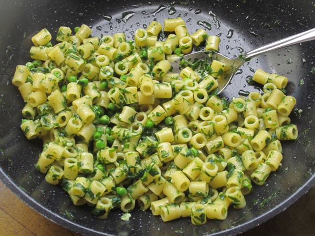 and cook another minute, then add the sweet baby peas. Add the pasta with some reserved pasta water.