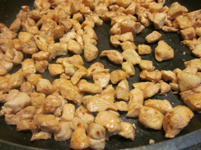 Heat 2 tablespoons olive oil in a large 11-inch (28cm) skillet over high heat and stir fry the chicken until no longer pink and slightly browned (about 5 minutes).