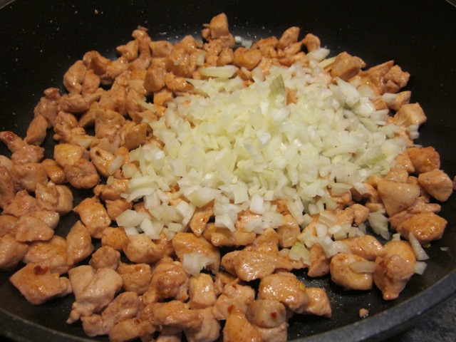 - Cook the chicken and onions: heat 2 tablespoons olive oil in a large 11-inch (28cm) skillet over high heat and stir fry the chicken until no longer pink and slightly browned (about 5 minutes).Reduce heat, add the onions and chilli flakes and continue cooking about 5 minutes.