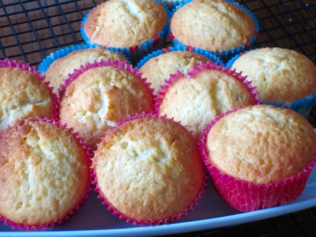 Using the lowest speed, fold in ⅓ buttermilk, ⅓ flour and the 3 tablespoons lemon juice. Fold in the rest of the flour and buttermilk in two batches. Scrape the sides and bottom of the bowl and remove it. Spoon the batter evenly into the prepared muffin cases.
