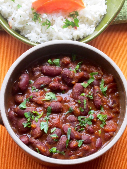 Add the boiled beans along with the boiling water and mix with the spices. Simmer for 10 minutes. Adjust the thickness of the beans by either adding more water or boiling rapidly to reduce water, if it’s too much. To get a thick gravy, mash some of the beans in the pot with the back of a round spoon. Just before serving, add the chopped coriander and serve the beans with rice or flat bread.