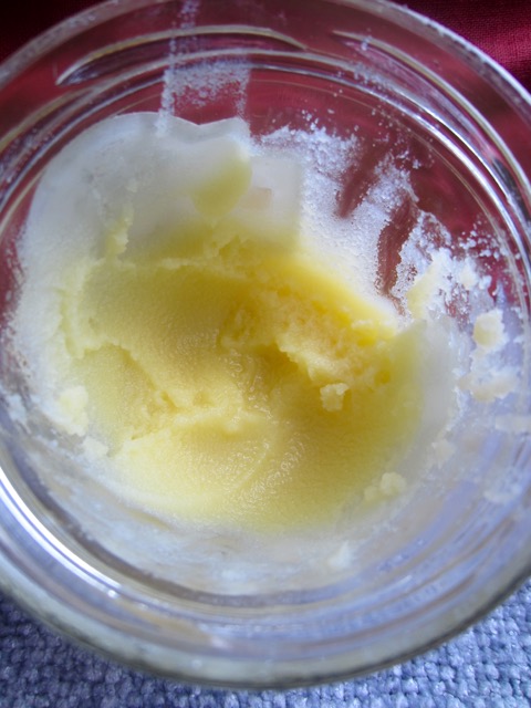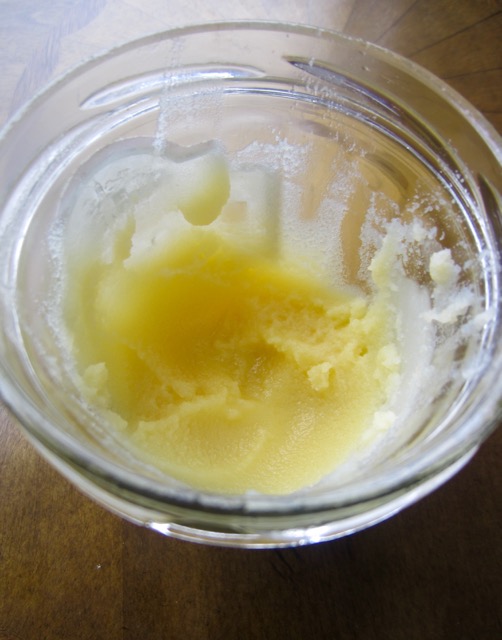 The resulting ghee has a longer shelf life than clarified butter and stays semi-solid at room temperature.