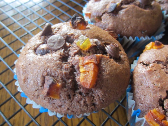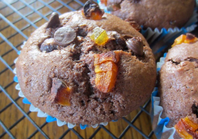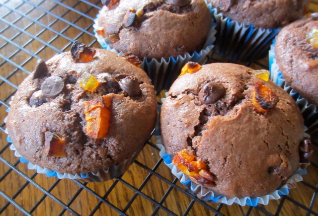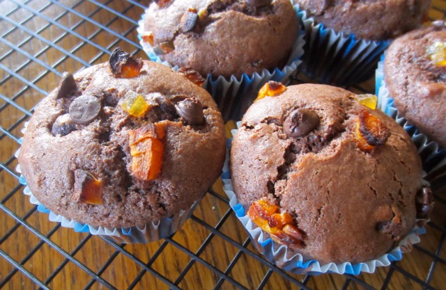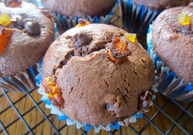 and mix gently. Fold in the chocolate chips, apricots and ginger. Spoon the mixture into the prepared muffin cases. Bake for 15-20 mins or until a toothpick inserted in the centre comes out clean. Set aside for 10 minutes then transfer to a cooling rack.