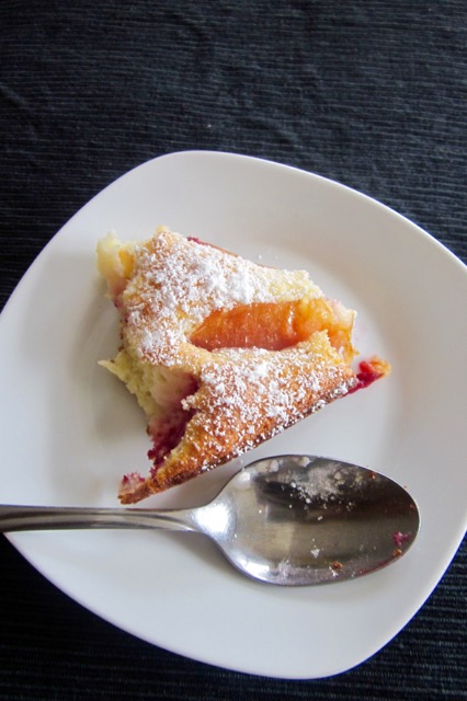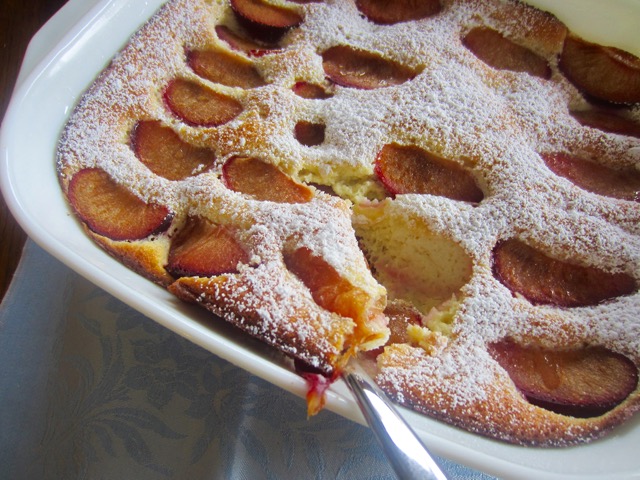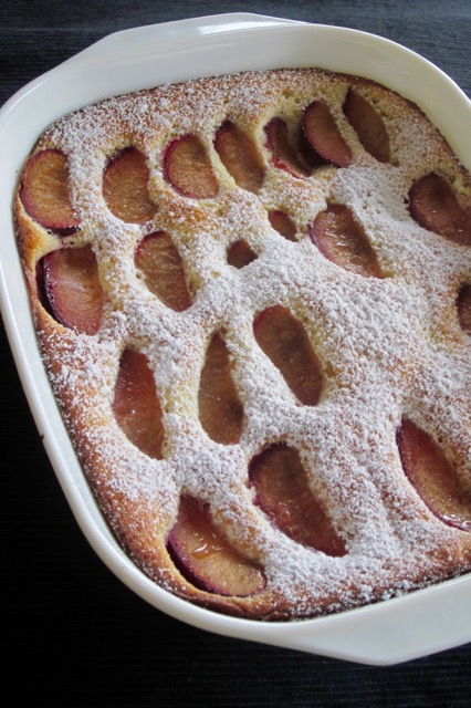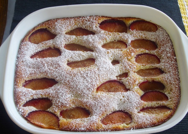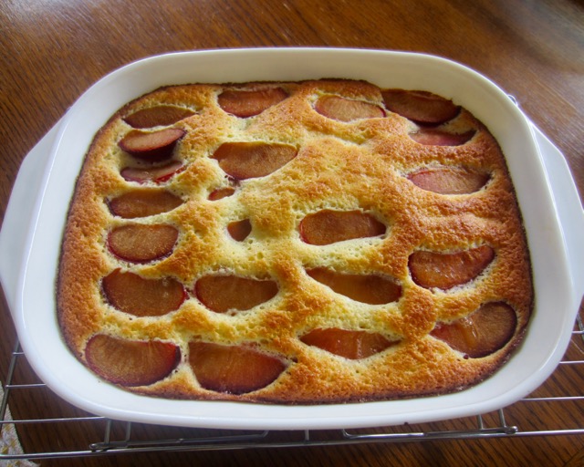 - In a separate bowl, beat the egg whites until soft peaks form. Using a spatula gently fold in the egg whites until incorporated. Pour the batter onto the prepared baking dish. Arrange the plum slices on top of the batter in a single layer. Bake 30-40 minutes until lightly golden on top and skewer inserted in the centre comes out clean.