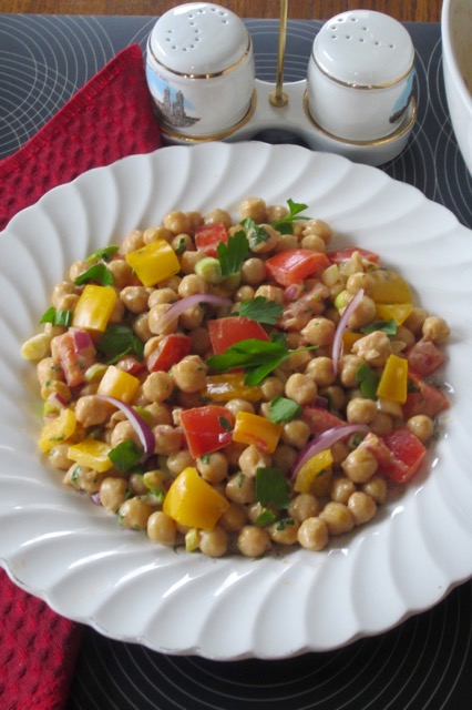 What about Tahini paste? (a paste made from ground, hulled sesame seeds)? Do you like it? I have a friend who eats spoonfuls of crunchy peanut butter. I thought it was rather silly and disgusting, but now I find myself eating spoonfuls of tahini paste. How ironic. I hope my friend never barges in on me. The best part of the chickpea salad I want to share with you today, is the tahini paste. If you don’t eat sesame, please don’t bother with the salad. I don’t think there is a real substitute for tahini paste. I can sum it up in few words: the salad tastes extremely nice. Please try it, if you can. I wish you a happy weekend. Enjoy whatever weather you’re experiencing.