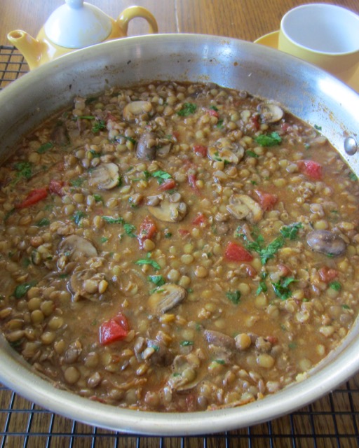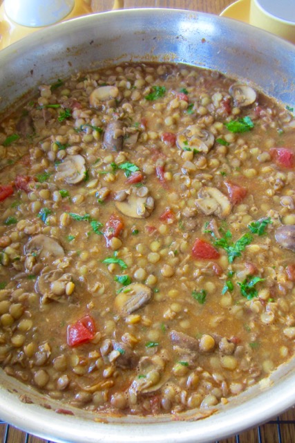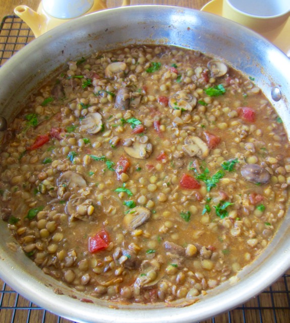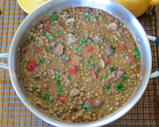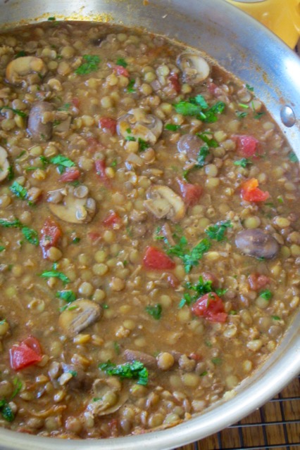 Add the lentils and cook for 1 minute, then add 4 cups broth (stock). Bring to the boil and simmer 20-25 minutes, stirring from time to time, or until lentils are cooked to your desired doneness.