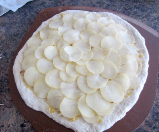 Top the sauce with the mozzarella cheese and then arrange the potato slices in a single partially overlapping layer, on top.