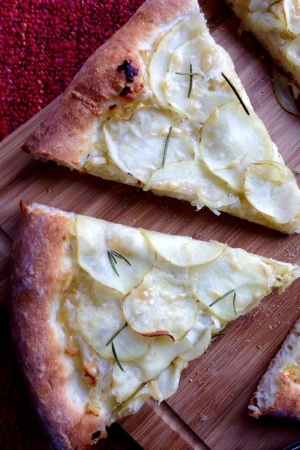 Transfer the pizza on to the stone and bake until the crust is nicely browned and the potatoes are coloured and slightly curled at the edges. This will take 8-15 minutes depending on your oven. Mine took 13 minutes (my oven is not very efficient).