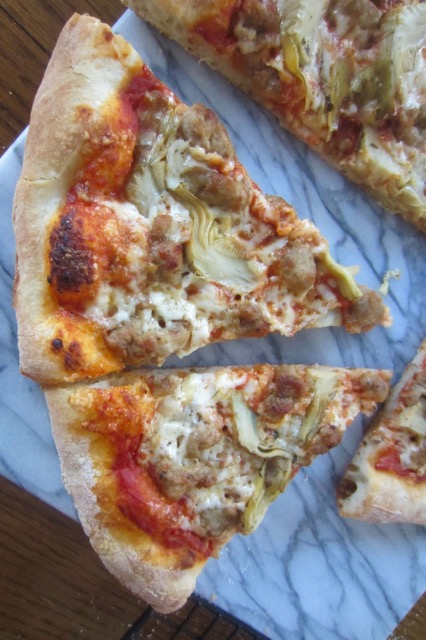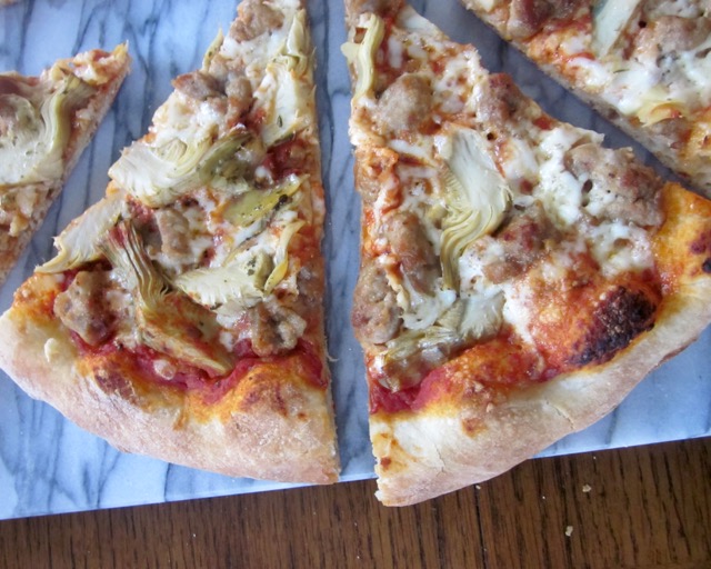 - Spread the pizza sauce over the pizza crust. Sprinkle oregano over the sauce then top with the grated mozzarella cheese. Arrange the artichoke and sausage.