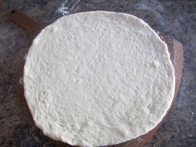 Roll or stretch the pizza dough and place on a lightly greased pizza pan or a pizza peel sprinkled with corn meal or semolina, if using a pizza stone.