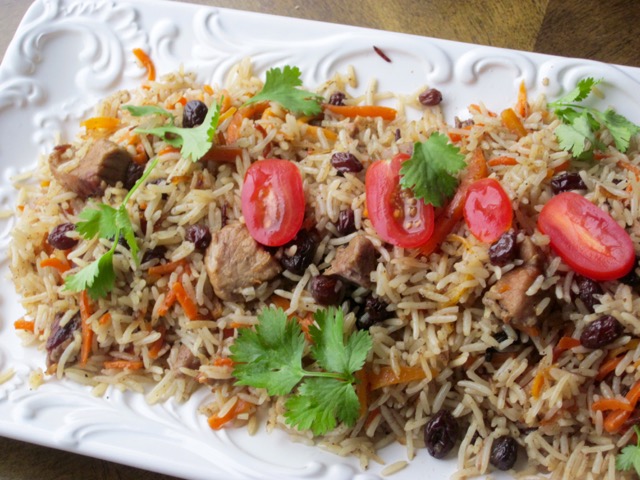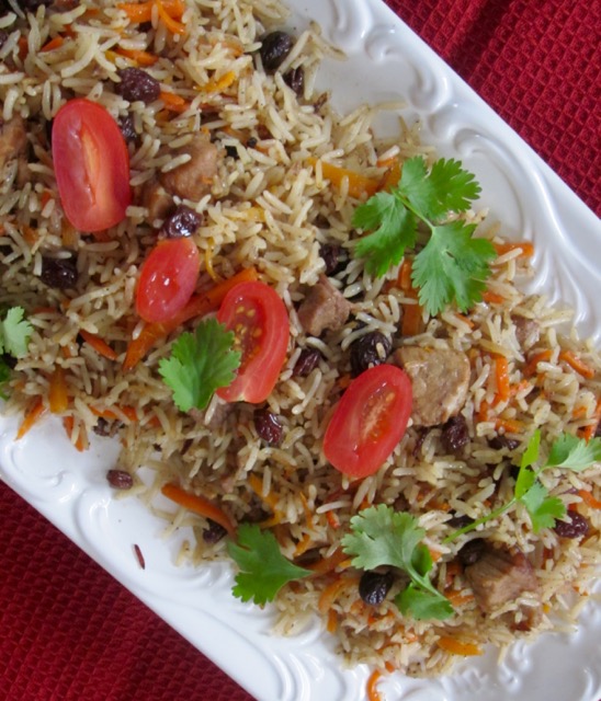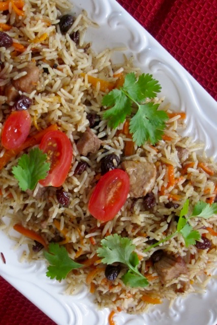 Layer the carrots and raisins then cook, three minutes, then drain the rice and layer on top of the carrots. Add the 400ml hot water and press the rice with the back of a spoon then cook, uncovered for ten minutes. Sprinkle another tablespoon of pulao masala on top and then poke holes into the rice with the handle of a wooden spoon to allow water to seep to the bottom of the pan. Cover the Dutch oven tightly and transfer to the preheated oven for 20 minutes @ 450ºF (230ºC).  Reduce the heat to 300ºF (150ºC) and continue cooking another 10 minutes in the oven.