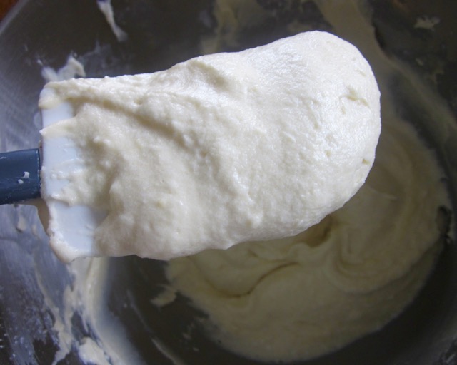 Combine the butter, cream cheese, sugar, eggs, flour and brandy in the bowl of your stand mixer. Beat on low speed until all ingredients are combined, then beat on medium speed until the batter is smooth and pale in colour (about 1 minute).