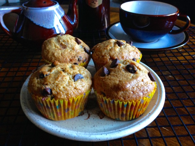 and stir gently to combine. Gently fold in the chocolate chips. Spoon the mixture evenly into the muffin cases and bake in the oven for 25-30 minutes or until golden and a toothpick inserted in the centre comes out clean. Set aside 5 minutes then transfer on to the cooling rack