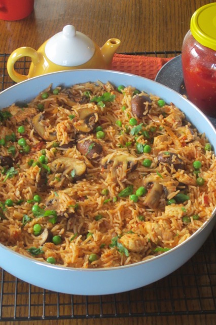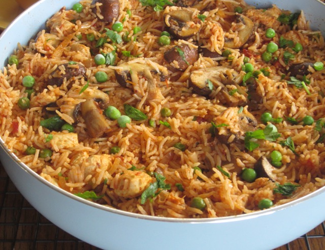 - Make the mushroom and chicken sauce: In the same skillet you stir-fried the chicken, heat 2 tablespoons olive oil and add the onion and mushrooms and cook over medium high heat until all the moisture is evaporated. Add cayenne pepper and paprika and cook for one minute, then add all the tomatoes and peas and cook for 5 minutes or until piping hot. Add the set aside chicken and stir to combine. keep the sauce over a low simmer.