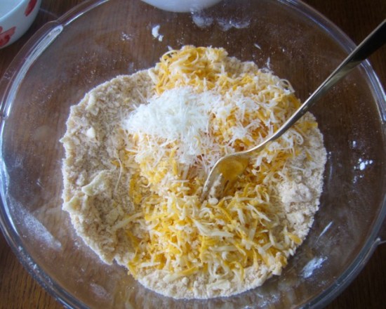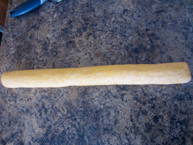 - Stir in the cheeses and add enough water to make a soft dough. Knead the dough, gently, on a lightly floured surface until smooth. Shape the dough into a 16 inch (40cm) sausage. Wrap in cling film and chill in the fridge for 1 hour.