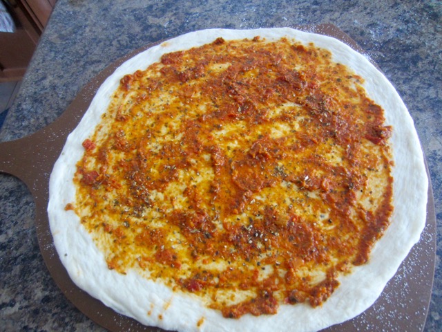 Roll or stretch the pizza dough and place on a lightly greased pizza pan or a pizza peel sprinkled with corn flour or semolina, if using a pizza stone. Spread the pesto over the pizza crust. Sprinkle the oregano over the pesto sauce.