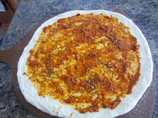 4. Roll or stretch the pizza dough and place on a lightly greased pizza pan or a pizza peel sprinkled with corn flour or semolina, if using a pizza stone.