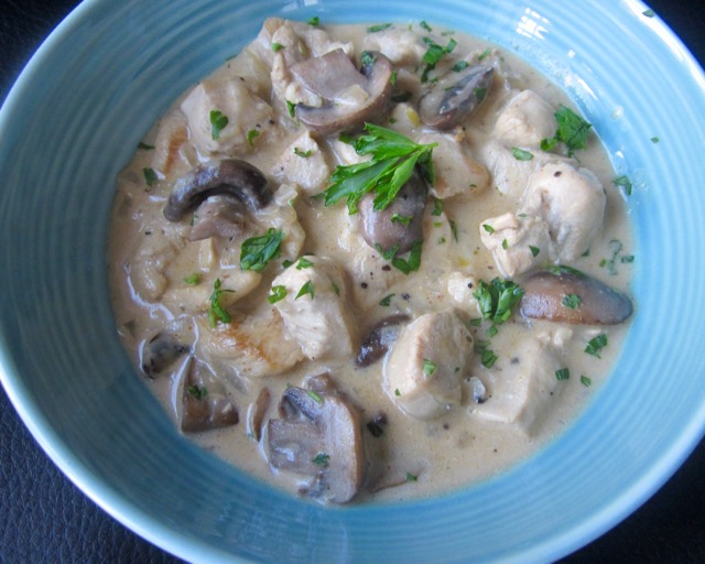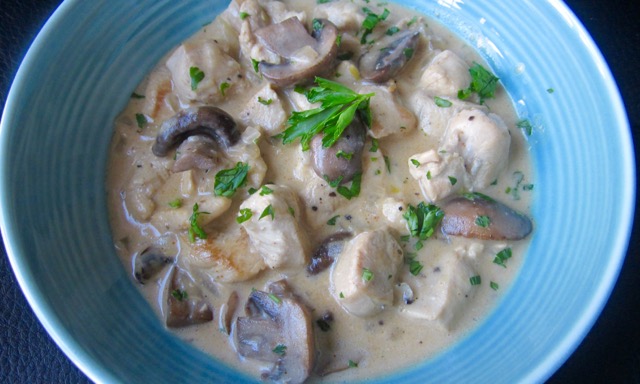 Now add back the set aside chicken and the wine and bring to the boil and cook uncovered over medium heat for 5 minutes until the wine is fully absorbed. Then add the flour and cook for 1 minute then gradually add the stock stirring continuously until well blended. Simmer for 10 minutes.