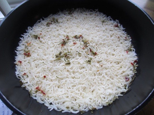 2. Heat the olive oil in a heavy based 11-inch pan or skillet. Add the rice, 1 tablespoon rosemary and pepper to taste, and stir and fry for 3-4 minutes or until the rice is fairly dry.